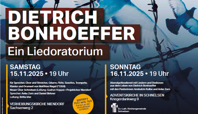 Das Bonhoeffer-Oratorium beschreibt anhand musikalischer Stationen das Leben des Theologen und evangelischen Pfarrers. Die Texte sind von Dieter Stork (Pfarrer i. R.) zusammengestellt und eine Mischung aus zeitgeschichtlichen Berichten, Zitaten und Briefen Bonhoeffers. Matthias Nagel (Professor an der Hochschule Herford) spannt in seiner Komposition einen großen stilistischen Bogen von Gregorianik über Kanons, Choräle, klassisch-moderne Elemente bin hin zu Protestsongs und populären Balladen. Das Oratorium wird in der Verheißungskirche am Vorabend des Volkstrauertags aufgeführt. Daher findet dort am Sonntag, 16.11., kein Gottesdienst statt.